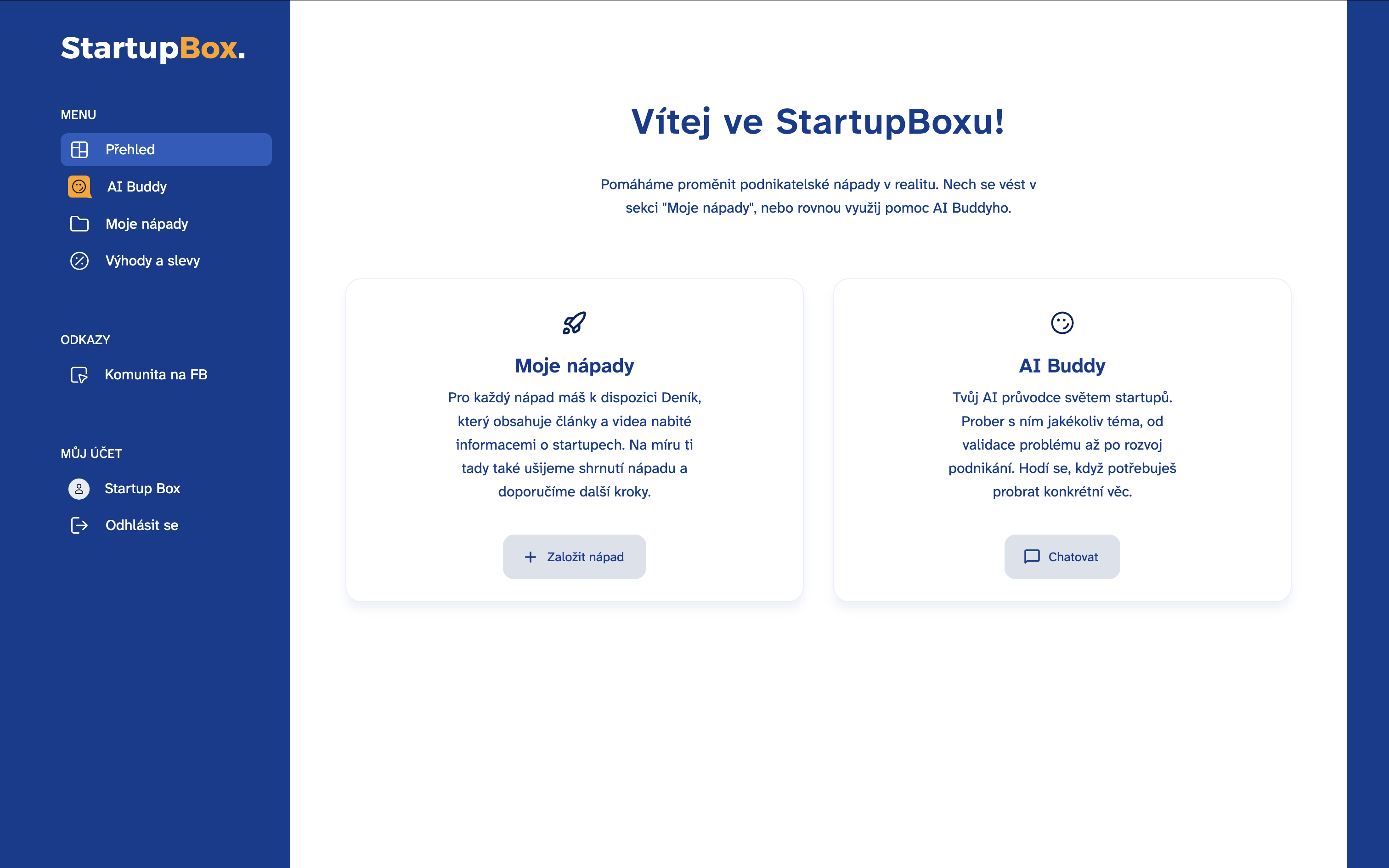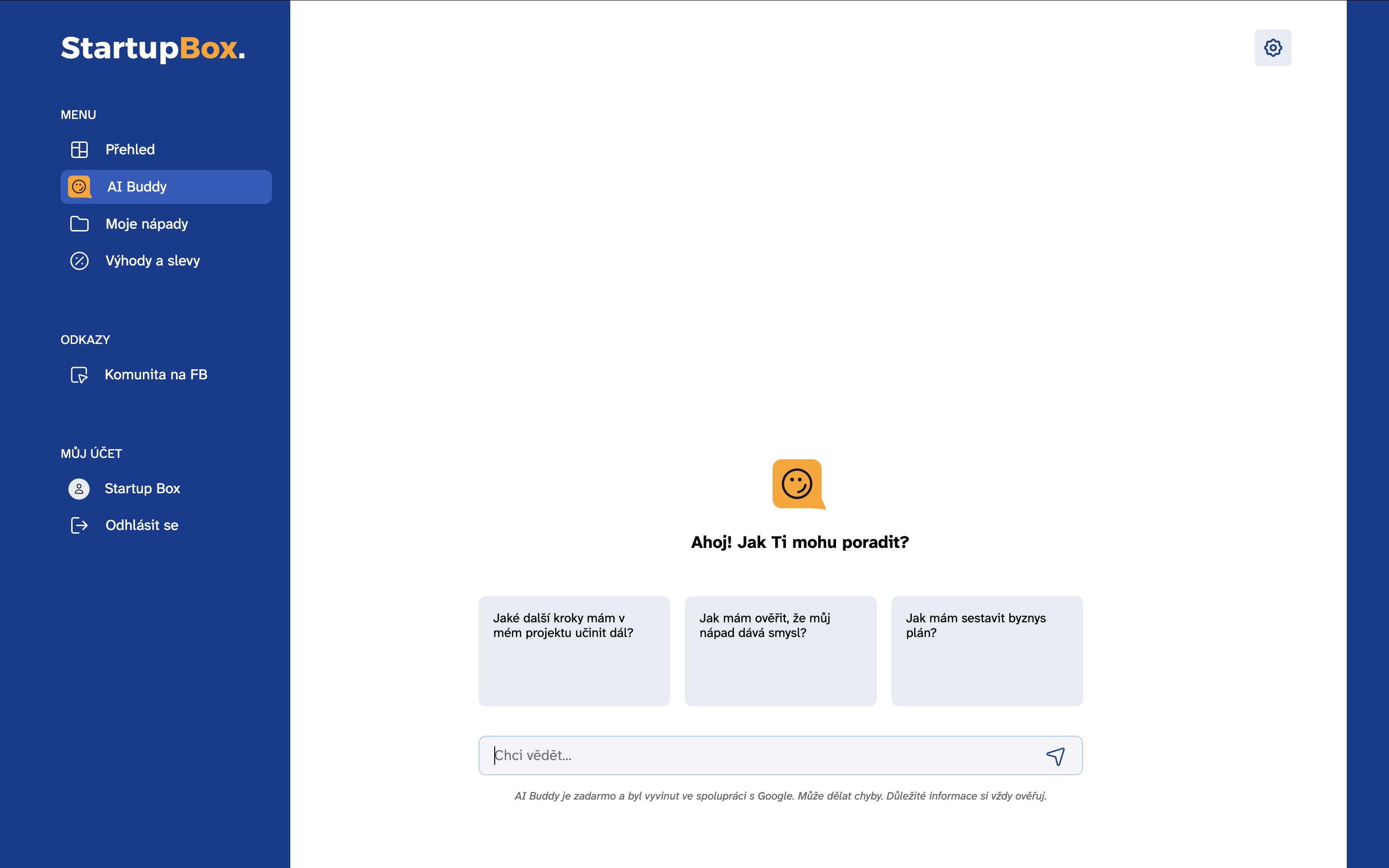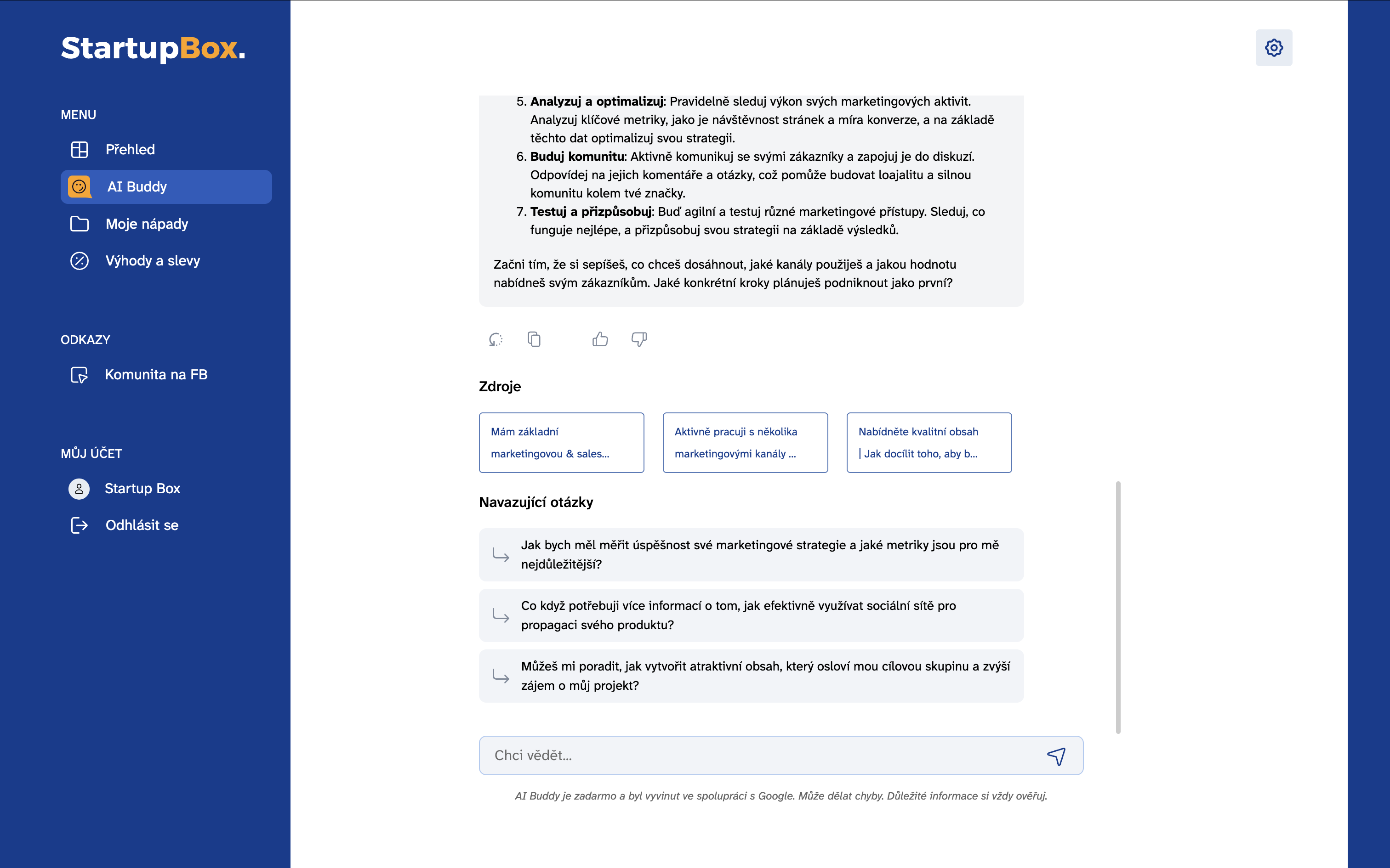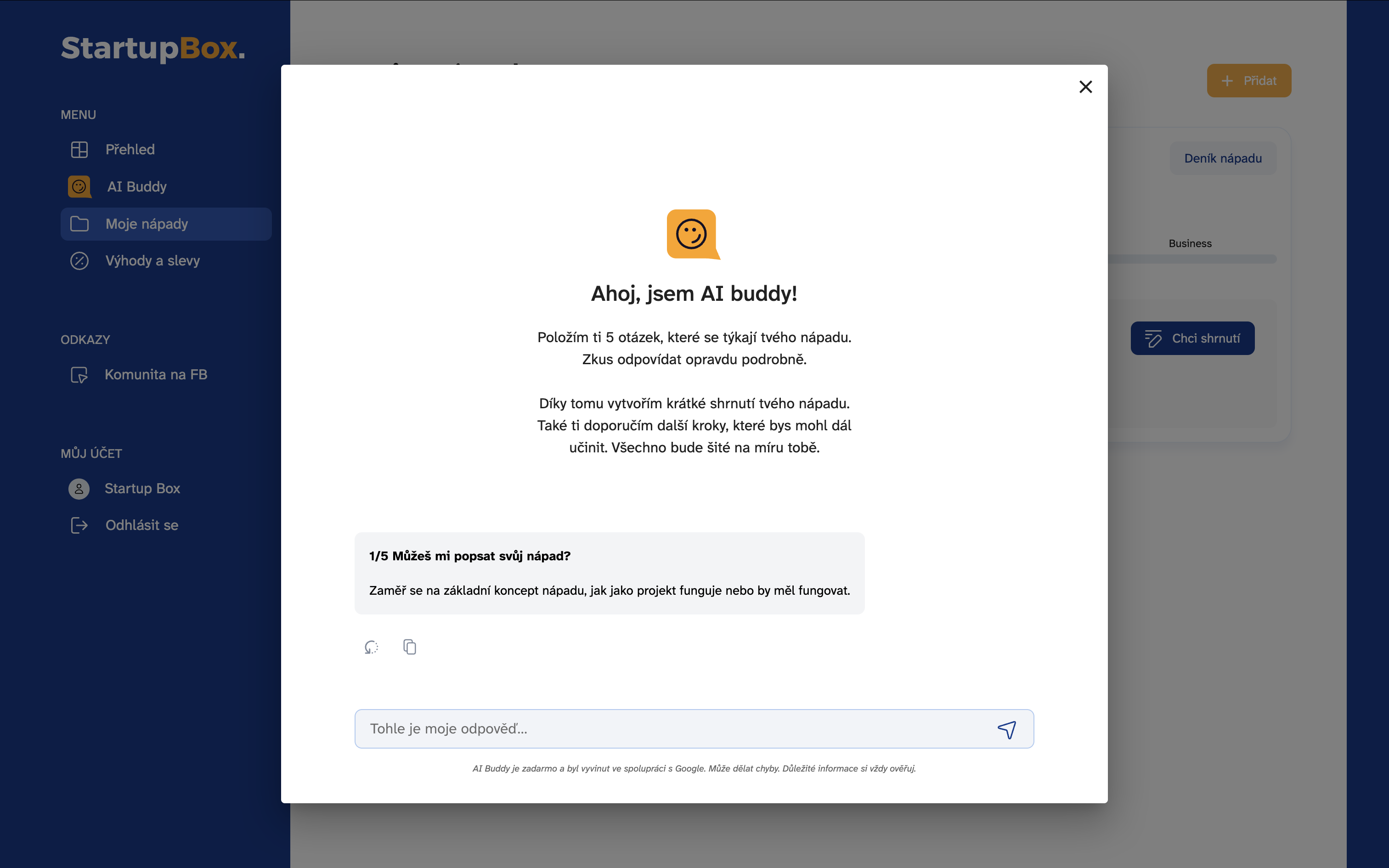 Pomůže vám utřídit myšlenky, připraví přehledné shrnutí projektu a doporučí, jaké další kroky podniknout. Pokud už máte nápad uložený ve StartupBoxu, naváže na něj a posune ho dál.